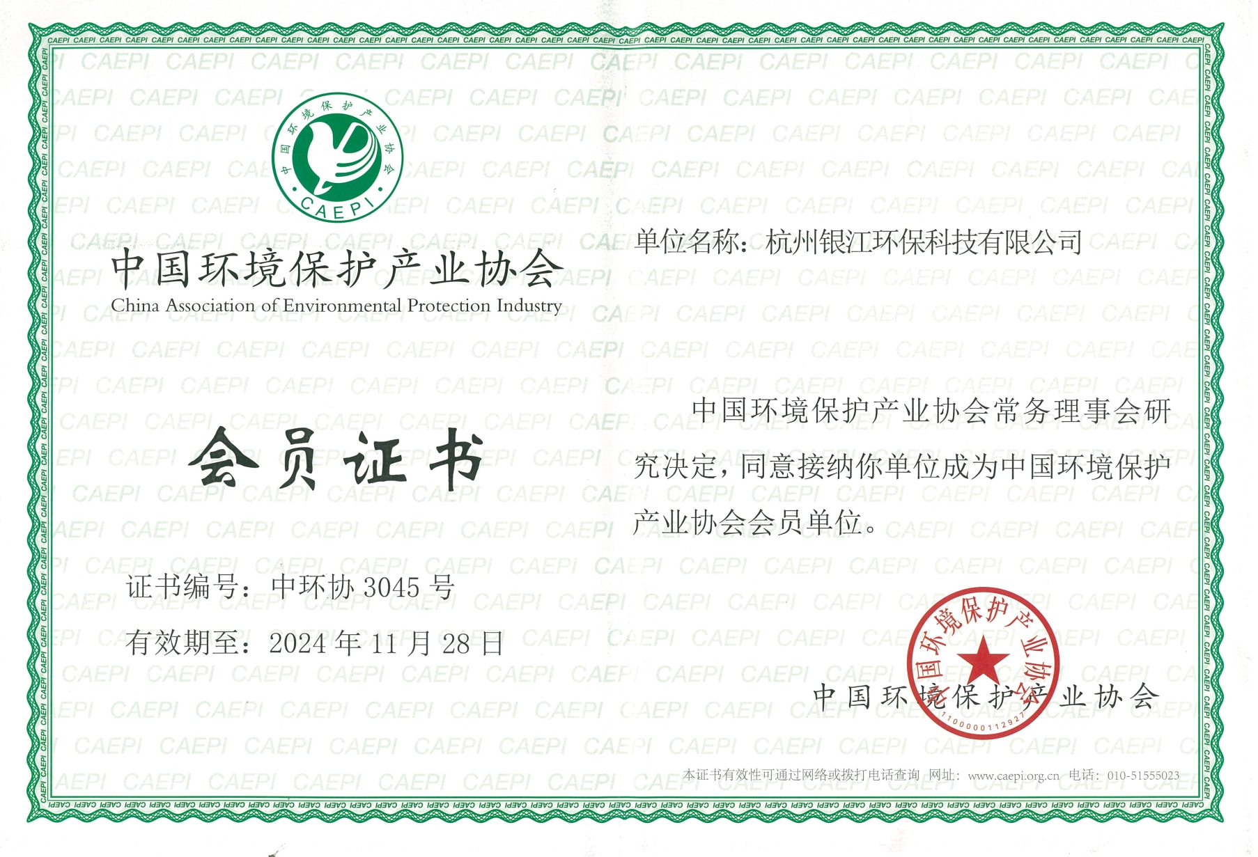 中國環(huán)境保護(hù)產(chǎn)業(yè)協(xié)會(huì)會(huì)員證