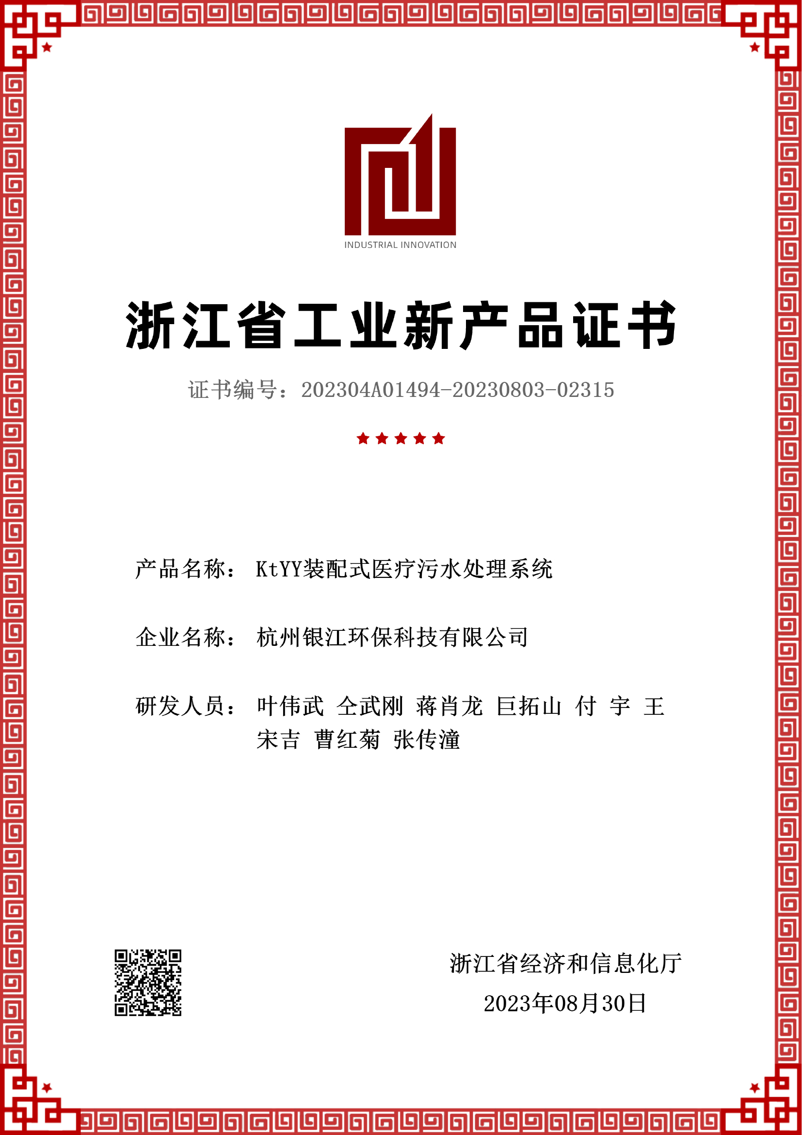 KtYY裝配式醫(yī)療污水處理系統(tǒng)新產(chǎn)品評價(jià)證書