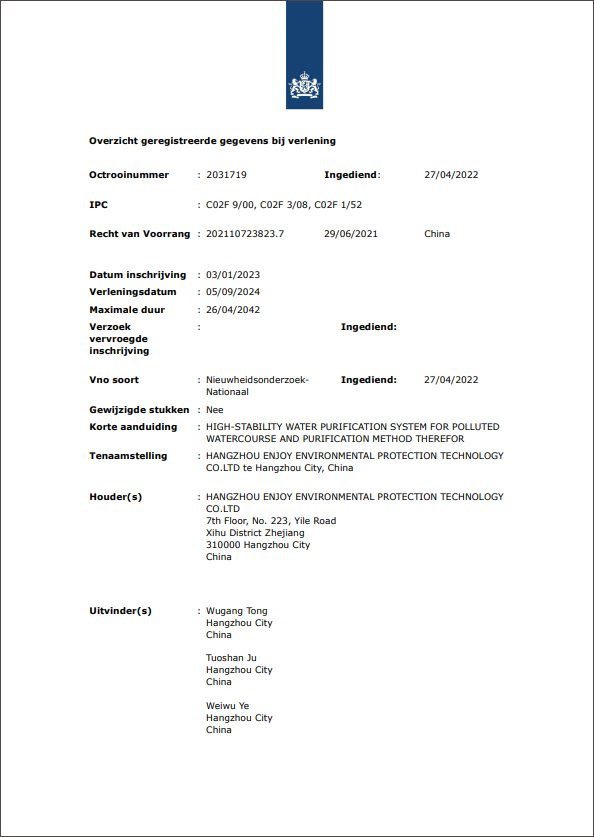 銀江環(huán)保公司榮獲荷蘭水處理發(fā)明專利