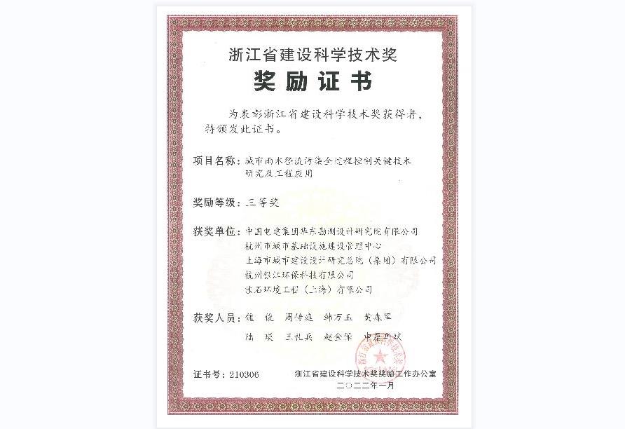 銀江環(huán)保《城市雨水徑流污染全過程控制關(guān)鍵技術(shù)研究及工程應(yīng)用》獲浙江省建設(shè)科學(xué)技術(shù)三等獎(jiǎng)。