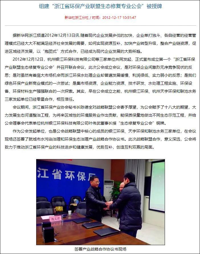 浙江省環(huán)保產(chǎn)業(yè)聯(lián)盟生態(tài)修復公會于2012年12月12日由銀江環(huán)保、天宇環(huán)保和聯(lián)池水務三家單位共同發(fā)起成立。